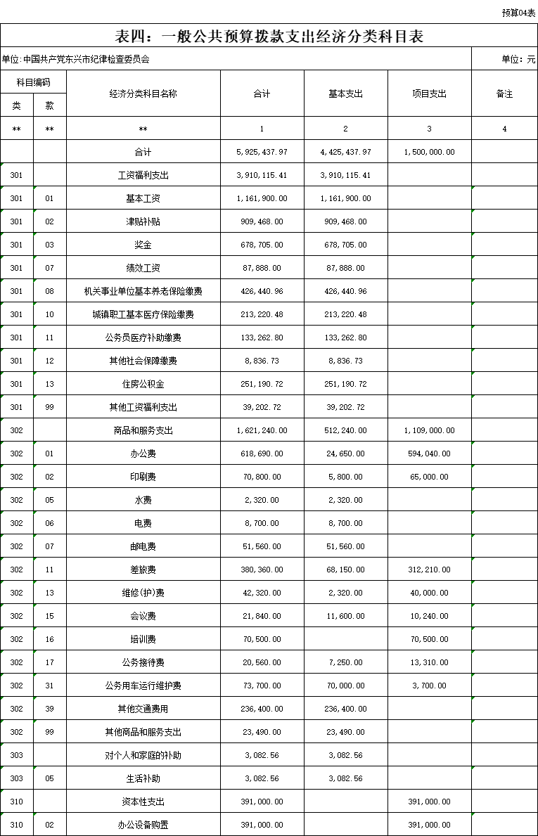四、一般公共预算拨款经济分类表