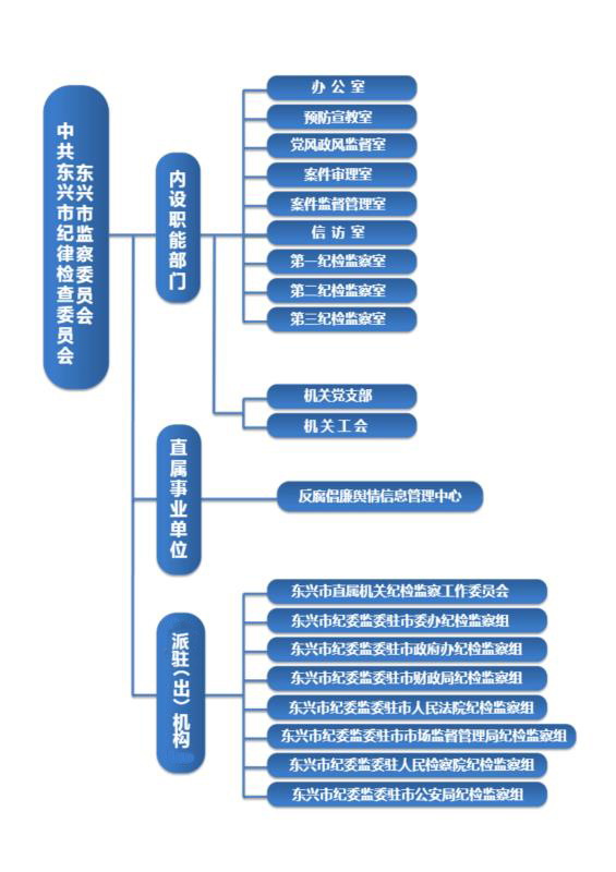 东兴市纪委监委组织机构包括:内设职能部门、直属事业单位和派驻纪检监察组。内设职能部门具体为:办公室、预防宣教室、党风政风监