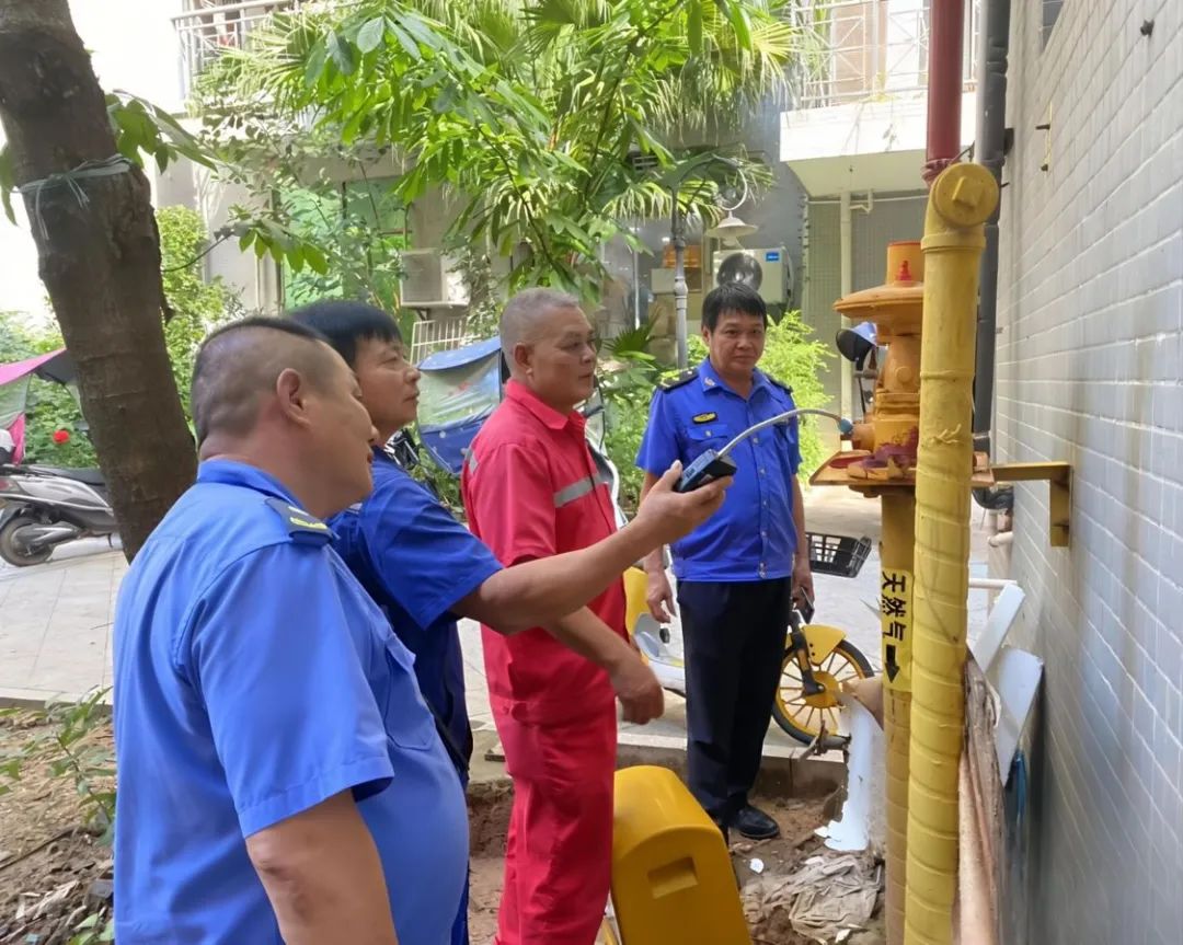 东兴市城市管理监督局在全市范围内开展燃气管道专项治理,拧紧燃气使用“安全阀”。图为工作人员正在小区排查燃气管道安全隐患。 东兴市城市管理监督局 供图