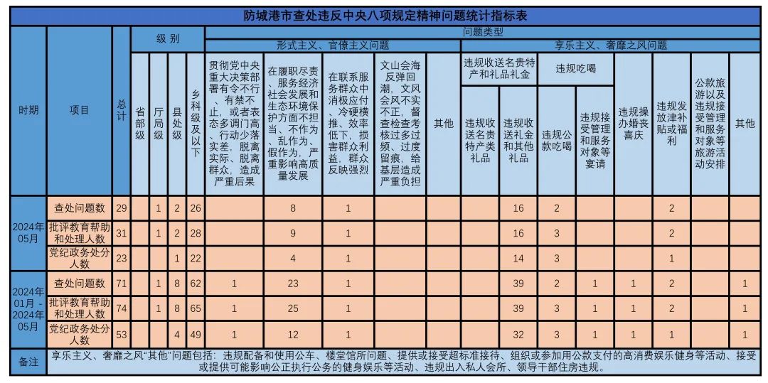 2024年1月至5月,防城港市各级纪检监察机关共查处违反中央八项规定精神问题71起,批评教育帮助和处理74人,党纪政务处分53人。其中5月